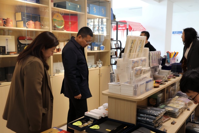 交流结束后,戚金波一行实地参观了华北电力大学文创店,近距离了解学校文化创意产品的开发理念、设计思路与运营模式。店内陈列的融合华电特色与校园文化元素的系列文创产品,既展现了华北电力大学深厚的文化底蕴,也彰显了学校在品牌文化传播方面的创新活力,为两校进一步探索校友文化共建、品牌联合传播等领域的合作提供了新思路。